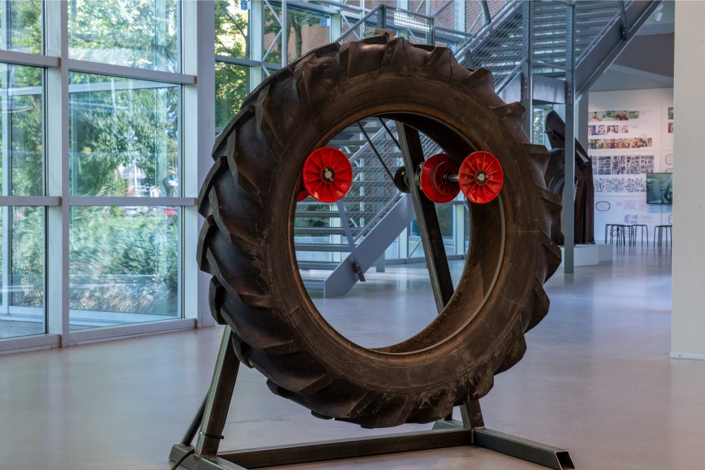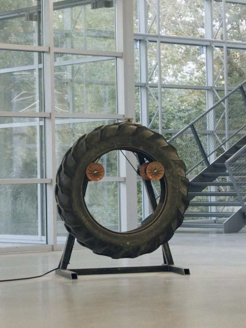 A massive tractor tyre rotates perpetually. Inside it, rough stones are spun around, slowly wearing down through the endless tumbling. The work mirrors the geological process of erosion, where natural forces grind boulders into smooth forms over time. The installation produces its own ‘primordial marbles’ from modern rubble, a nod to the very first marble ever shaped by nature itself.